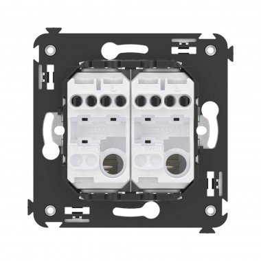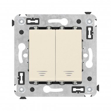 Кнопка двухклавишная. Назначение: для монтажа в подрозеточные коробки глубиной не менее 45 мм (код 59301). Используется в качестве кратковременного включения источника питания энергией. Характеристики: 2 модуля, диаметр отверстий для ввода кабелей – 3 мм (по 2 отверстия на одну клемму); винтовые зажимы;. шаблон для зачистки кабеля – 11 мм; номинальный ток – 10 A; номинальное напряжение – 230 В; фиксация в подрозеточные коробки при помощи каркаса с лапками (код 4400802) и. саморезов. Цвет: "Закаленная сталь".